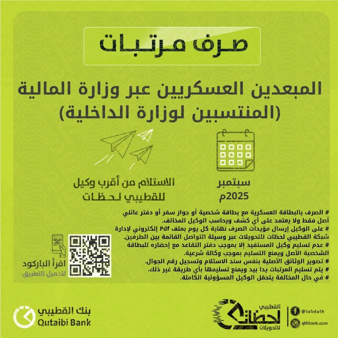أعلن قبل قليل عن تدشين عملية صرف مرتبات المبعدين العسكريين عبر وزارة المالية (المنتسبين لوزارة الداخلية) لشهر سبتمبر 2025م عبر بنك وفروع القطيبي.